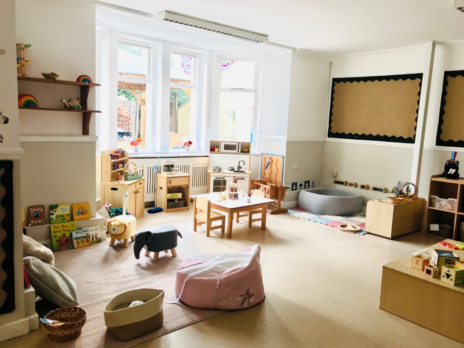The book corners are situated by large windows which overlook the garden areas and both rooms have direct access to a small courtyard play area specifically for the nursery children, allowing the children to free-flow from the playroom into one of the two outdoor learning environments. The book corner offers a quiet and relaxing space for children to share books and stories together or listen to music and sing songs.